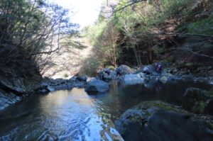 渓谷は岩が湿っていたため慎重に歩き、最奥の5m滝に辿り着きました。