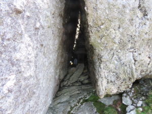 無人の山頂で展望を楽しんでから下山開始。すぐに左手に回り込んで岳詣りの岩の隙間を見学しました。