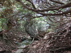 エスケープルートの大株歩道を下ると時々雨が強まります。例年と比べると少なめながら縄文杉を目指す登山者と何人もすれ違いました。
